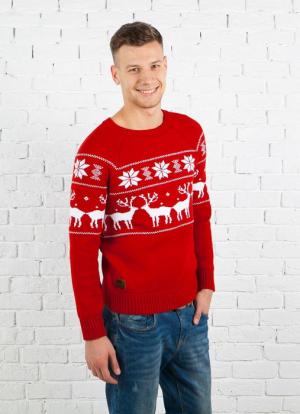 Вплетение традиционного орнамента в своеобразный узорный герб, где олени смотрят друг на друга, придает изделию изысканность и строгость. Колоритно и привлекательно смотрится сочетание основного бордового цвета с белоснежными оленями. Цельная цепочка попарно расположенных оленей смотрящих друг на друга, продолжающаяся на рукавах, дополненная акцентами белого цвета, расположенными ближе к плечам подчеркивает спортивный характер модели. Сочетание насыщенного красного цвета основного фона с белыми акцентами создает ощущение новогоднего праздника, эмоционального поднесения. Это идеальный новогодний подарок для мужчины.