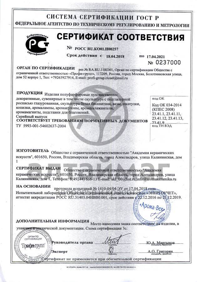 Аромалампы производства компании «Академия керамических искусств» отличаются невысокой ценой и огромным разнообразием моделей. Размеры керамических аромаламп варьируются от 5 до 15 см, некоторые аромалампы могут состоять из двух частей (например, если лампа выполнена в форме символа «инь-янь», то черную и белую части можно разделить и использовать по отдельности