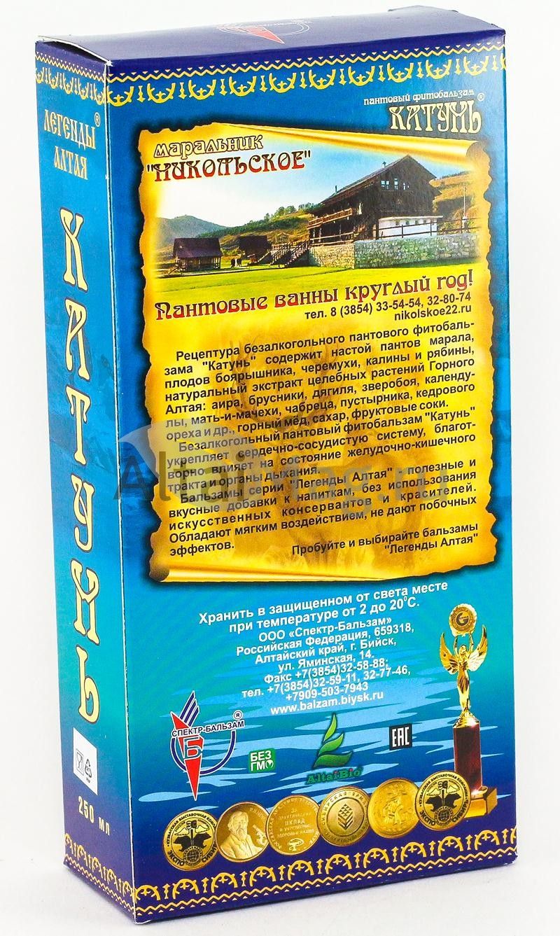 Катунь входит в серию бальзамов Легенды Алтая. Их употребление очищает организм от радионуклидов и токсинов, повышает жизненный тонус и предупреждает многие болезни. Бальзамы этой серии не содержат искусственных добавок. Поэтому целебные травы и коренья Горного Алтая без помех отдают накопленные полезные вещества.