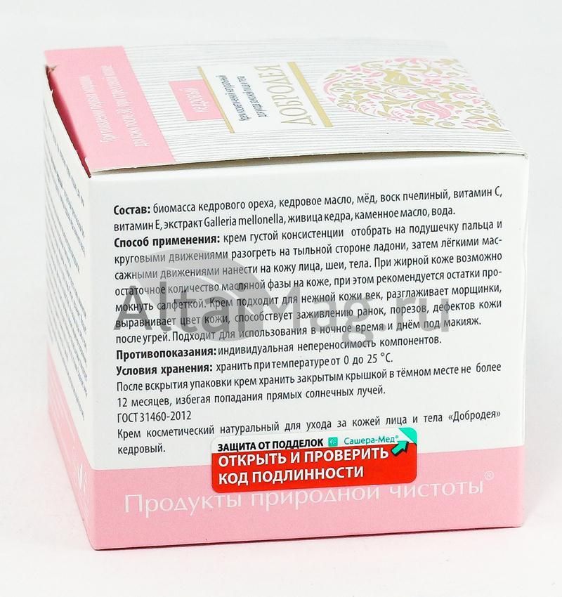 Крем косметический «Кедровый» серии «Добродея» - натуральный крем на основе биомассы кедрового ореха, масла кедрового, живицы кедровой, меда, каменного масла, Galleria mellonela. Крем не содержит синтетических компонентов, эмульгаторов, консервантов.