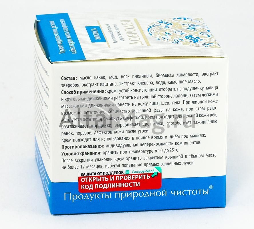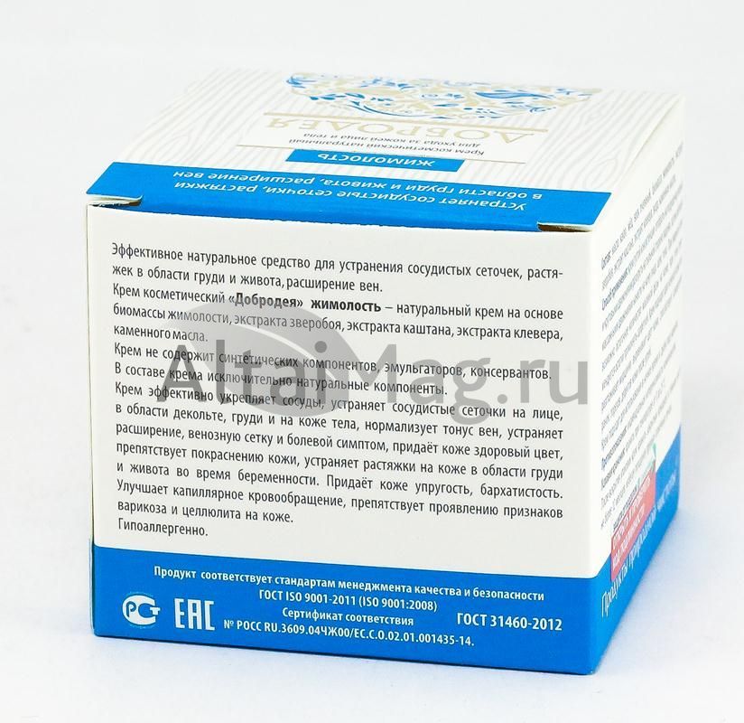 Крем «Жимолость» серии «Добродея» эффективно укрепляет сосуды, устраняет сосудистые сеточки на лице, в области декольте, груди и на коже тела, придает кожи здоровый цвет, препятствует покраснению кожи, устраняет растяжки на коже в области груди и живота во время беременности. Придает коже упругость, бархатистость. Улучшает каппилярное кровообращение, препятствует проявлению признаков варикоза и целлюлита на коже. Гипоаллергенно.