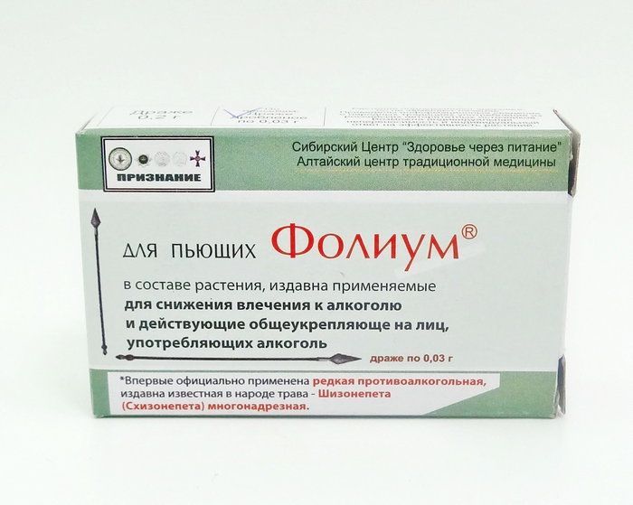 Фолиум для пьющих, в составе растения, издавна применяемые для снижения влечения к алкоголю и действующие общеукрепляюще на лиц, употребляющих алкоголь.