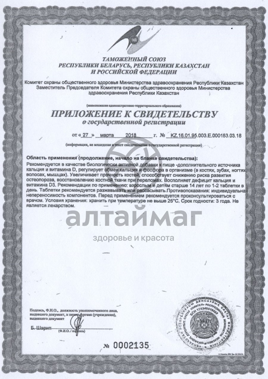 Сбалансированный состав жевательных таблеток восполняет дефицит кальция и витамина D3, регулирует обмен кальция и фосфора в организме (в костях, зубах, ногтях, волосах, мышцах), увеличивает прочность костей, способствует снижению риска развития остеопороза, восстановлению костной ткани при переломах. 30 жевательных таблеток с апельсиновым вкусом по 2,0г.