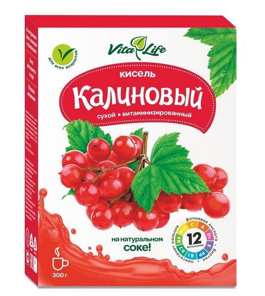 Растворимый кисель на основе концентрированного калинового сока. Не требует варки. Обогащен витаминным премиксом: витамин С, никотинамид, кальция Д-пантотенат, витамины Е, В12, В6, В1, В2, А, фолиевая кислота, биотин, витамин Д3. Благодаря уникальной технологии производства все полезные вещества, содержащиеся в натуральных экстрактах, остаются стабильными при высоких температурах.