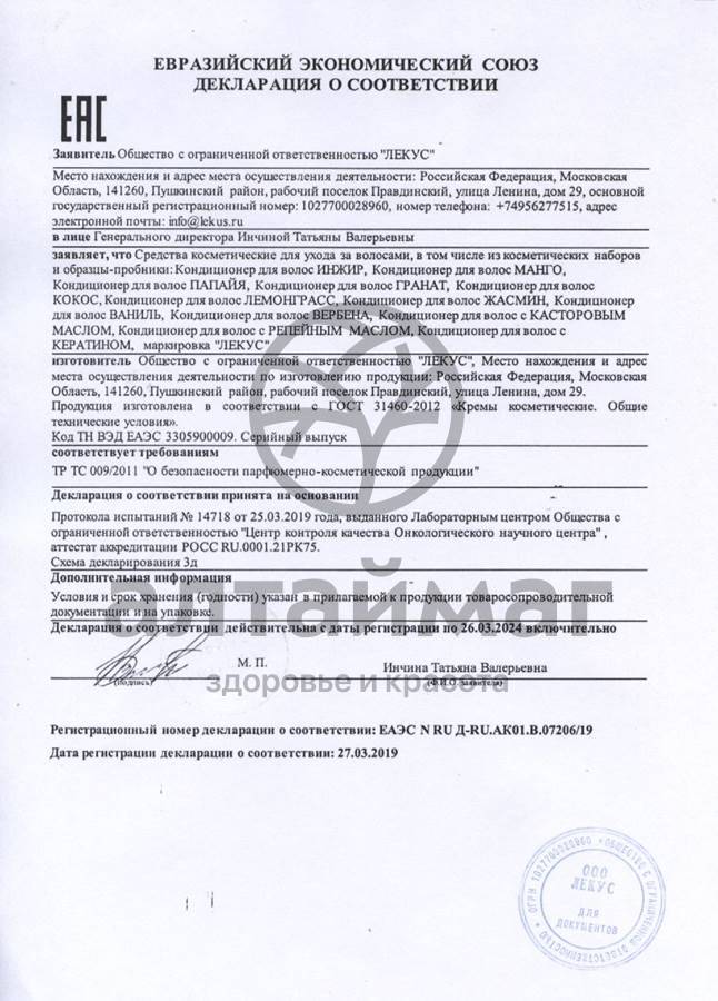 Aqua, Cetearyl Аlcohol, Cetrimonium Chloride, Begentrimonium Chloride, Carica Papaya Fruit Extract, Hydrolyzed Keratin, Laurdimonium Hydroxypropyl Hydrolyzed Wheat Protein, Hydroxyethylcellulose, Tocopheryl Acetate, Retinyl Palmitate, Panthenol, Neroli Oil, Patchouli oil, Parfum , Methylchloroisothiazolinone, Methylizothiazolinone, Citric Acid.Назначение