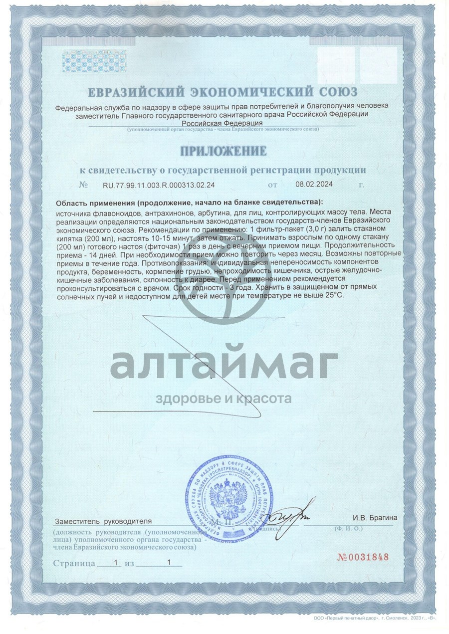 Оздоровительный, очистительный, жиропонижающий чай. Очищает желудок, кишечник, обладает ферментативным действием, устраняет несварение пищи. Выводит шлаки из организма, нормализует вес. Очищает печень, желчный пузырь. Понижает содержание жиров на стенках сосудов, в крови. Оздоровляет кожу.