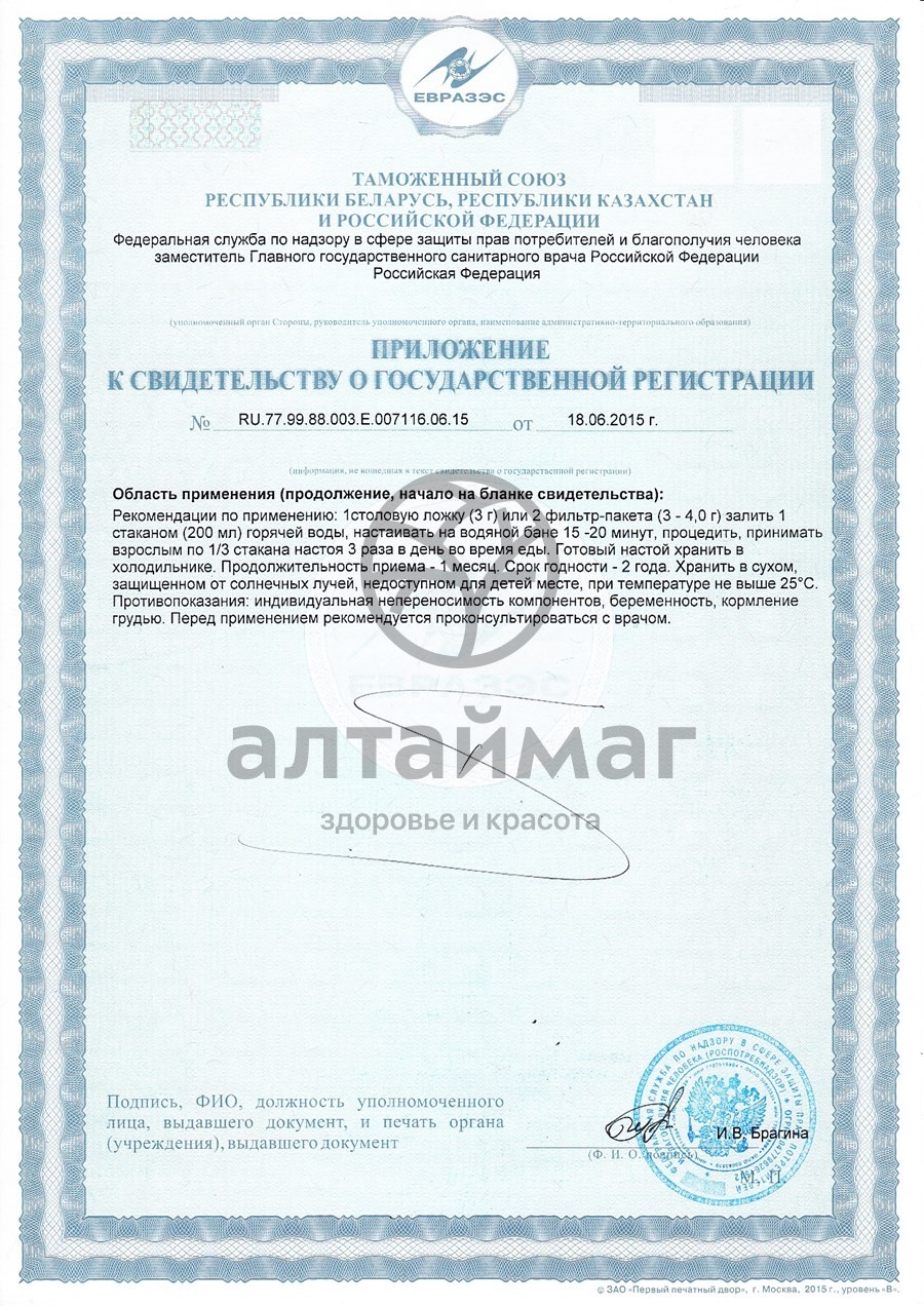 2 фильтр-пакета (3 г) залить 1 стаканом (200 мл) горячей воды, настаивать на водяной бане 15-20 минут, процедить, принимать взрослым по 1/3 стакана настоя 3 раза в день во время еды.