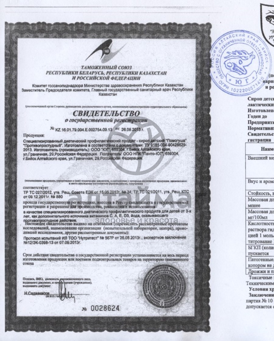 Сироп детский «Помогуша рекомендуется в качестве диетического профилактического продукта для детей от 3-х лет, дополнительного источника витаминов С, А, Е, D3, йода, оказывающего противопростудное действие.
