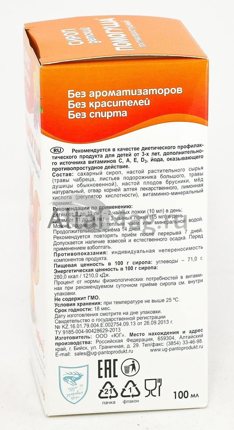 Состав: сахарный сироп, настой растительного сырья (травы чабреца, листьев подорожника большого, травы душицы обыкновенной), настой плодов брусники, мёд натуральный, отвар корней алтея лекарственного, лимонная кислота (регулятор кислотности), витаминно-минеральный премикс.